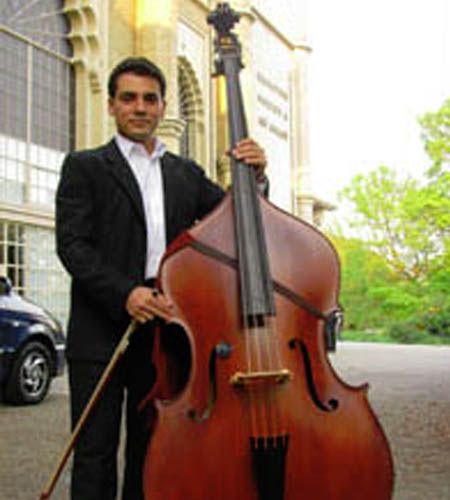 In the picture is Meherban with his new Martin bass and his former Hungarian student bass also supplied by us, his student bass saw him all the way through his education and when he got his first orchestral job he decided to part exchange his student bass for a specially made Martin bass. I wanted let you know how contented I am with the bass. It has already been a joy getting to know all its many qualities: it's warmth, it's willingness to release volumes of sound and especially it's ethereal clarity across the register. I can remember trying out some lovely old English basses but this instrument seems to fit me the best. This, I'm sure, doesn't surprise you, but it feels like a mature bass already and thank you again for the beautiful varnish work.